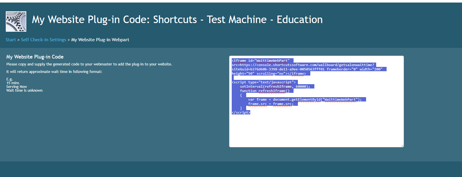 example: https://shortcuts-cstestmachine.mylocalsalon.com/onlinequeue/SelfCheckIn/Home?siteGuid=b276d60b3398de01a9ee0050563fff03