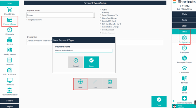 *note this is an active payment type no other options need to be selected. This only needs to be created once and can be re-used again for further manual refunds.