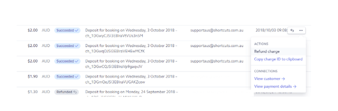 - Locate the relevant payment. Hover your mouse over the payment and click the Refund arrow (OR click ‘Refund charge’ on the ellipse menu)