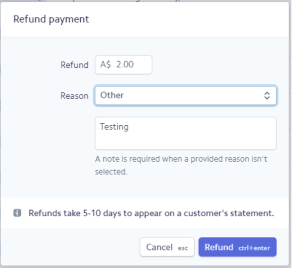 - Select the relevant reason for the refund. If you choose ‘Other’, you will be prompted to type a note.